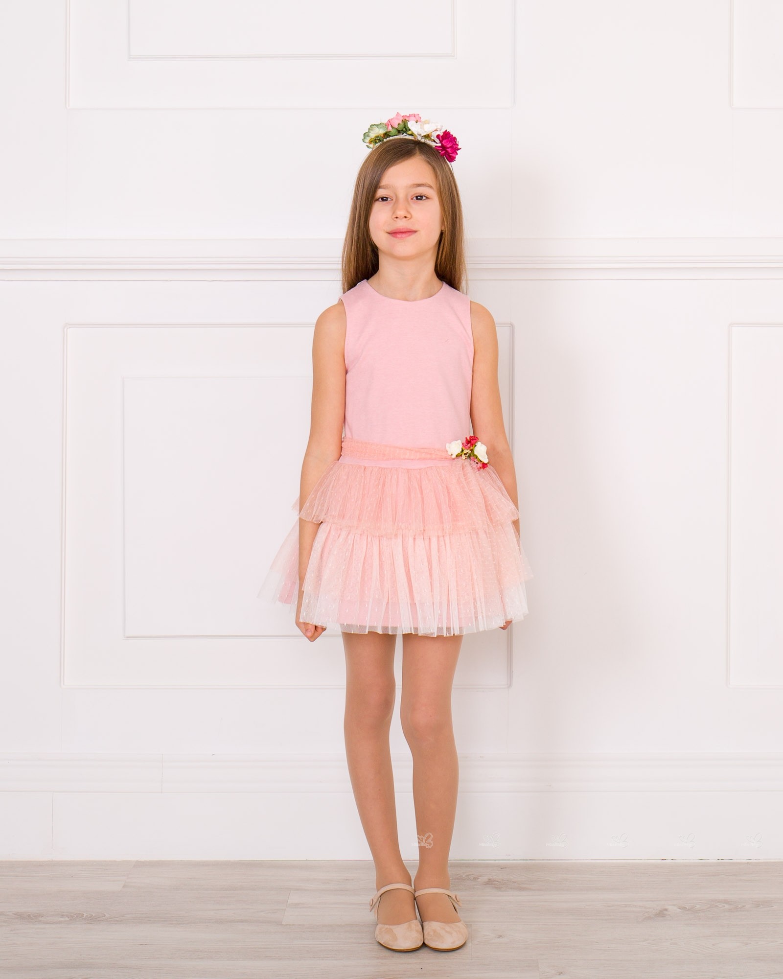 Vestido niña estampado a topitos y flores en tonalidades de rosa rematado con encaje en volantes y pecho.